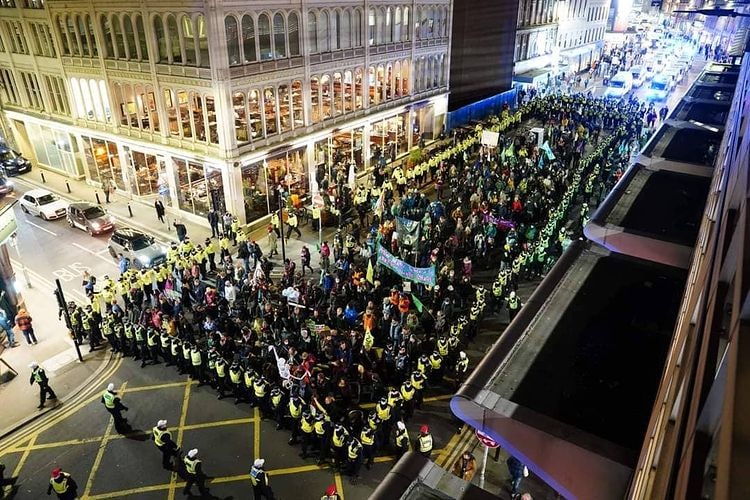 El miércoles 3 se celebró una acción contra el greenwashing que se desarrollaba con normalidad, hasta que en un momento, cortaron la calle peatonal. Minutos expectantes. La marcha cambió de sentido y ocupó la calle. Nos siguió una gran escolta de policía que intentó entorpecer y bloquear la muchedumbre. Finalmente, tras algunos ágiles movimientos, nos bloquearon a las 500 personas con una técnica llamada kettling. Durante tres horas el cordón policial consiguió encerrarnos al aire libre pero no debilitar nuestros cánticos ni nuestra música. Les respondimos gritando con fuerza: "¿A quién se supone que servís y protegéis?". No hay que olvidar que las fuerzas del orden son un instrumento más de control junto con los medios de comunicación. Varias de las acciones planeadas para la semana fueron frustradas por la presencia de policías, y la filtración de información por los grupos telemáticos, encontrándonos con más de 60 policías controlando la entrada de la fábrica de una gran responsable de extracción de combustibles fósiles, donde se pretendía hacer una protesta. La enorme cantidad de recursos de inteligencia e infiltración para mitigar la actividad por la justicia climática y los pocos que ponen en apostar por ella, revelan claramente las prioridades del gobierno británico.